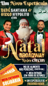 Devido ao grande sucesso, o Reder Circus anuncia a estreia do “Natal Broadway no Reder Circus”, uma produção que promete ser a maior celebração natalina já vista na região e com participação especial do eterno trapalhão Dedé Santana, como peru de natal, e Diego Hypolito como nosso Duende Natalino.