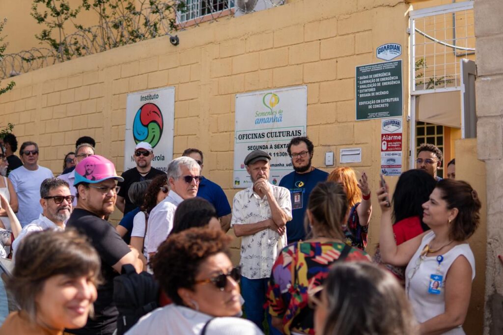 A comitiva assistiu a uma apresentação poderosa das crianças e adolescentes do projeto Sementes do Amanhã, que desde 2022 oferece oficinas gratuitas e diárias de teatro afrocentrado, musicalização, canto, dança, hip-hop e muito mais.