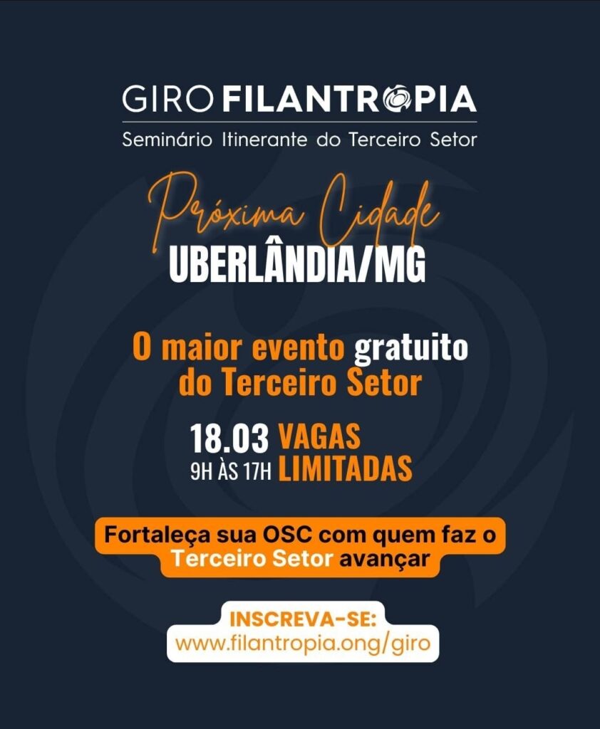 O maior evento gratuito do Terceiro Setor está de volta! Nesta semana, dia 18 de março de 2026, Uberlândia recebe o Giro Filantropia – Seminário Itinerante do Terceiro Setor, que acontecerá no Auditório do Bloco 3Q, no Campus Santa Mônica da Universidade Federal de Uberlândia (UFU).